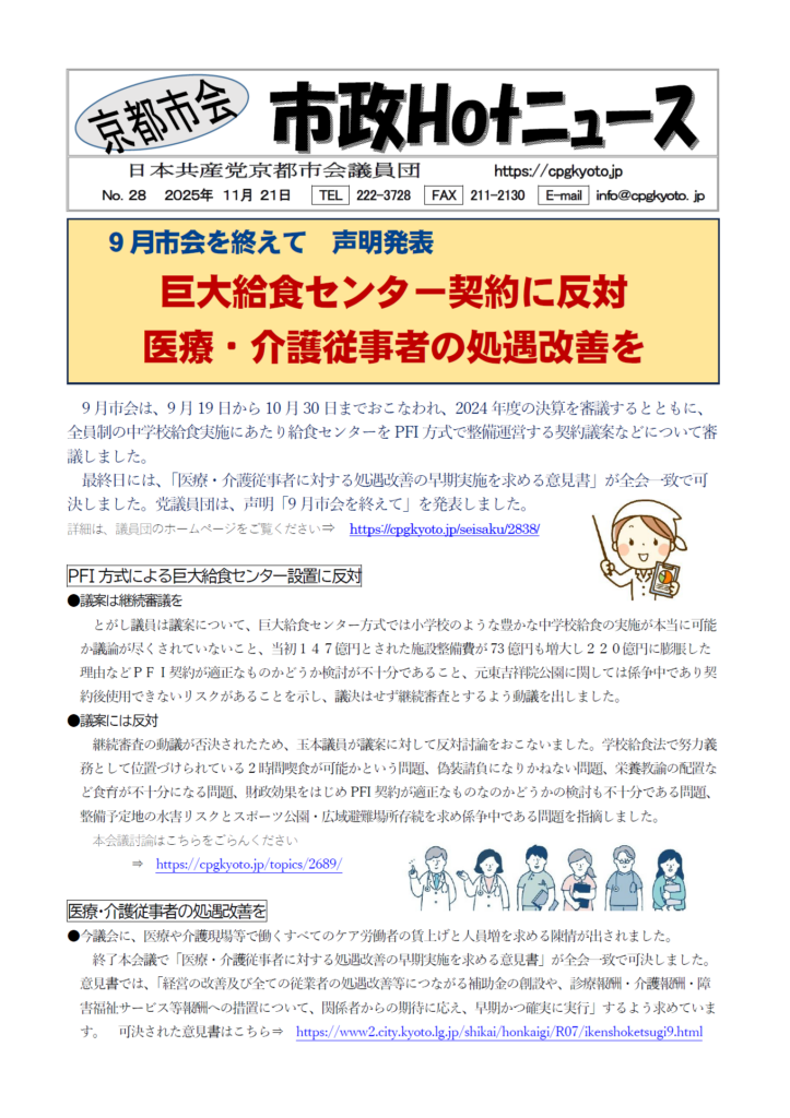 9月市会では、2024年度決算の審議とともに、全員制中学校給食の実施にあたって巨大な給食センターをPFI方式で整備・運営する契約議案なども審議されました。