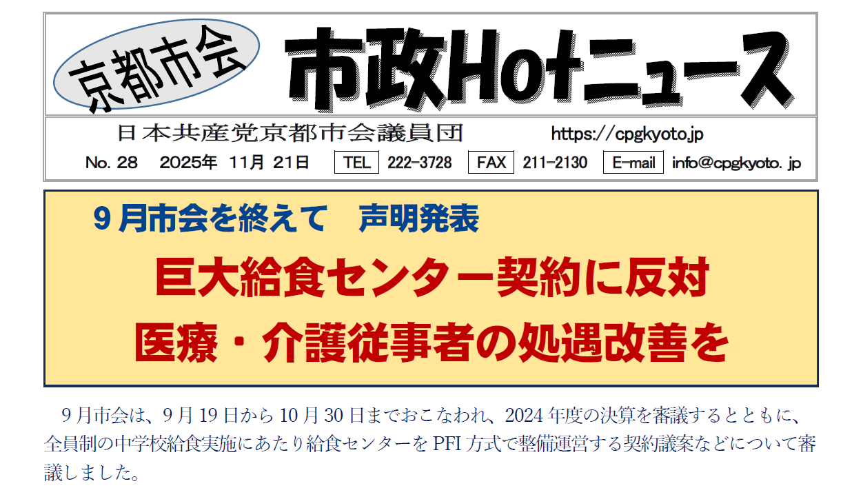 9月市会では、2024年度決算の審議とともに、全員制中学校給食の実施にあたって巨大な給食センターをPFI方式で整備・運営する契約議案なども審議されました。