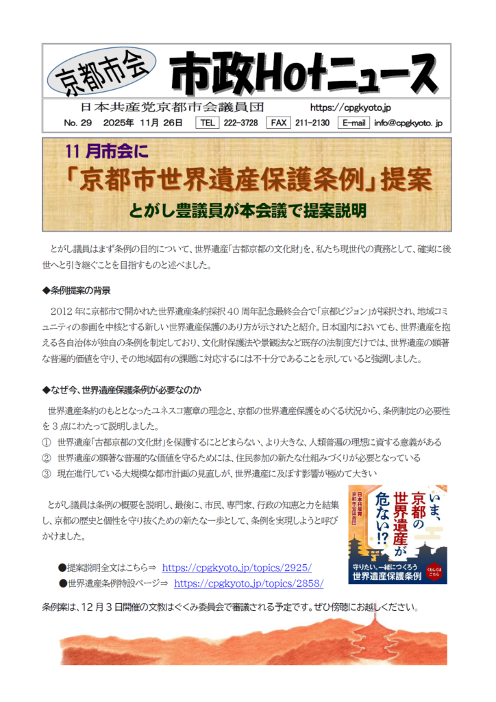 党議員団は、11月市会に「京都市世界遺産保護条例」案を提案し、11月25日の本会議において、党議員団を代表して、とがし豊議員(左京区)が提案説明を行いました。