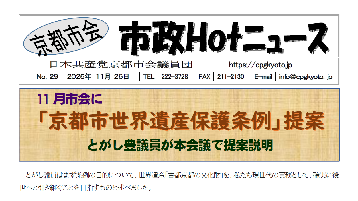 党議員団は、11月市会に「京都市世界遺産保護条例」案を提案し、11月25日の本会議において、党議員団を代表して、とがし豊議員(左京区)が提案説明を行いました。