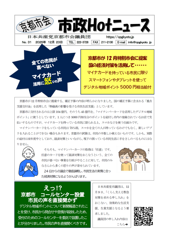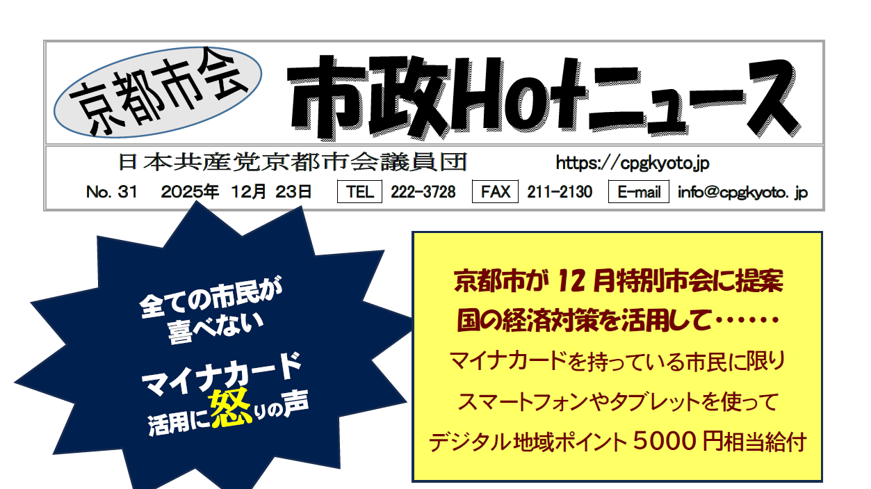 京都市が12月特別市会で提案する補正予算において、「物価高の影響を受ける市民生活支援」として、約45億円を「マイナンバーカードを活用したデジタル地域ポイント」に使う、としています。これは、マイナカードを持っている市民に限られる上、スマホなどを使う仕組みです。