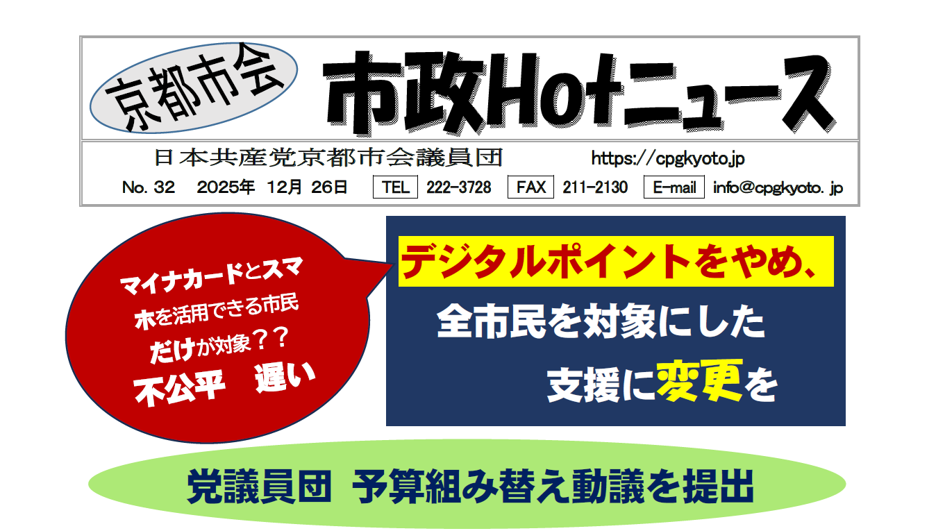 党議員団は、京都市が12月特別市会で提案された補正予算のうちの「マイナンバーカードを活用した『市民生活応援デジタル地域ポイント』給付」について、デジタルポイントをやめて全市民を対象とした支援に変更するよう「予算組み替え動議」を提出しました。