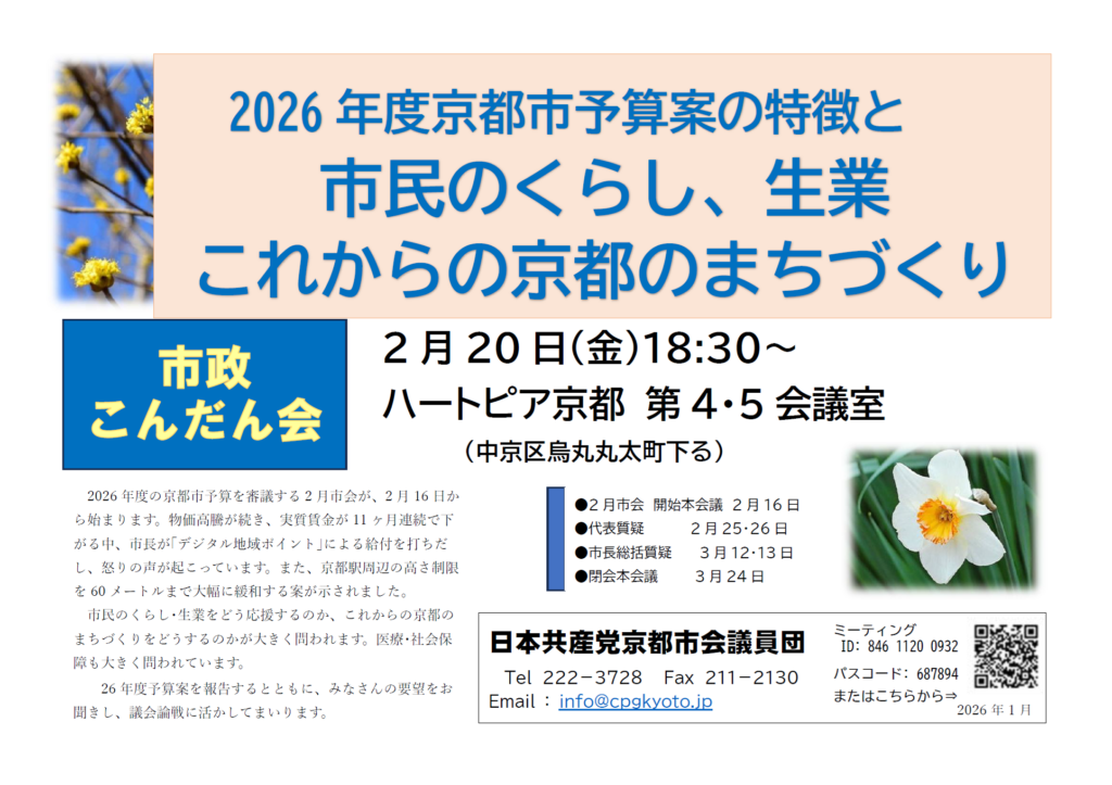 2月16日より、2月市会が始まります。2月市会では、2026年度予算などを審議する予定です。つきましては、2026年度予算案などについて報告し、皆さんのご意見をいただくための「市政こんだん会」を、2月20日(金)の18:30より開催します。