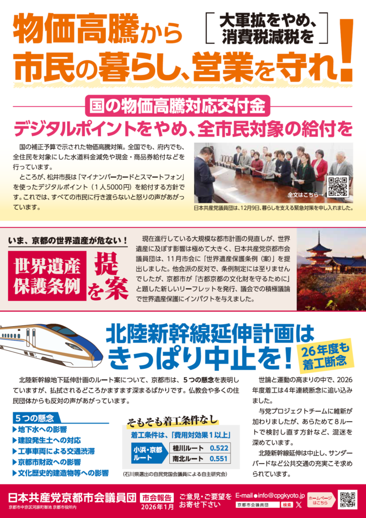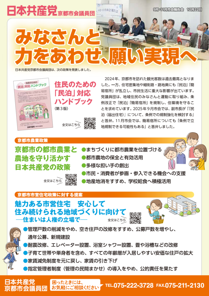 党議員団の市会報告(9月市会・11月市会の結果について)が完成しました。京都市内にお住まいの方には、今後広く配布予定です。