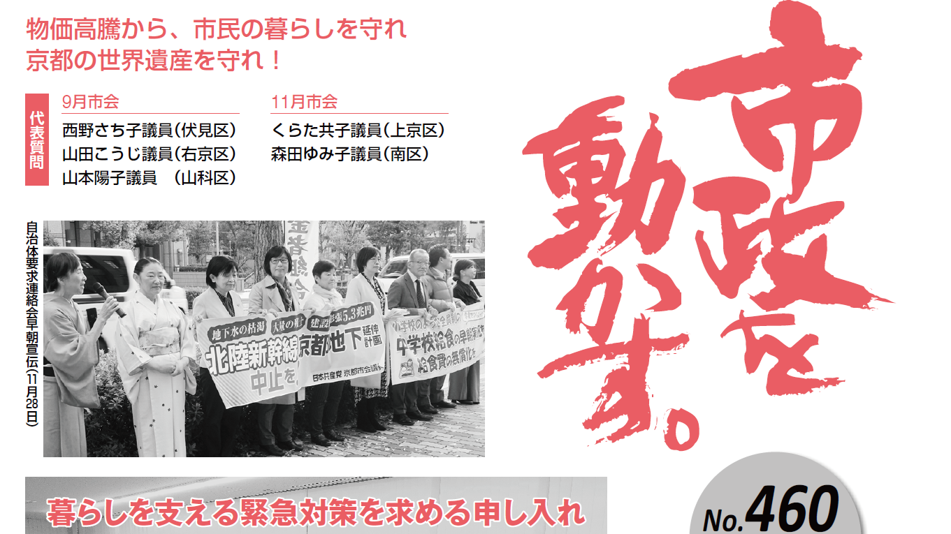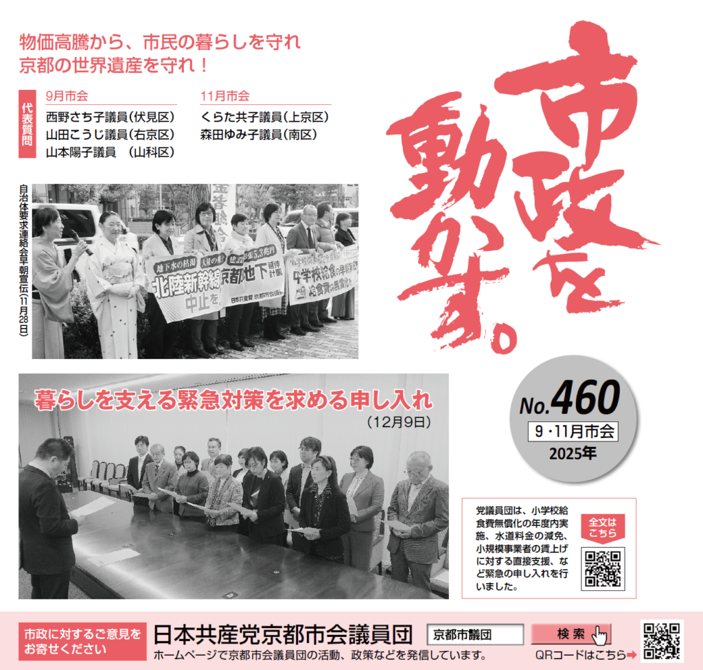 党議員団ニュース「市政を動かす」が完成しました 2026.01.23 お知らせ 党議員団ニュース「市政を動かす」No.460(2025年9月市会・11月市会)が完成しました。 以下のPDFデータよりぜひご覧ください。 PDFデータはこちら→市政を動かすNo.460