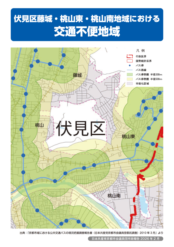 パネルをご覧ください。醍醐地域に隣接する、藤城・桃山東・桃山南学区でも、生活の足確保が切実に求められています。この3学区には合計で約1万世帯、2万4000人を超える市民が暮らしていますが、バス停から300m圏外、500m圏外という交通空白・交通不便地域が多く存在します。
