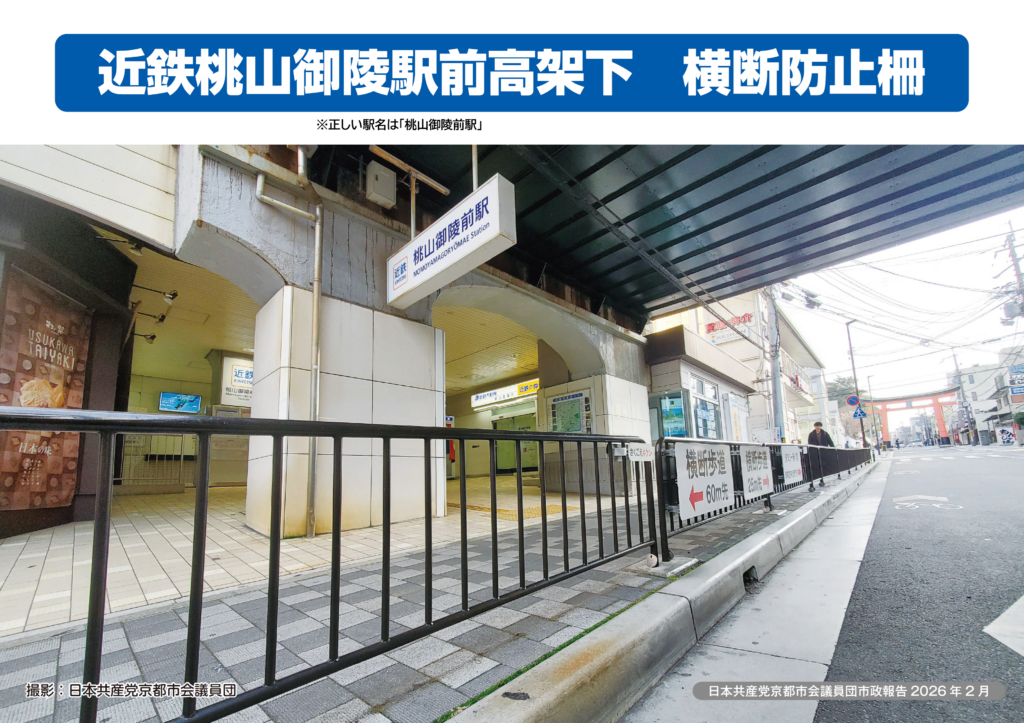 パネルをご覧ください。2023年6月、近鉄桃山御陵前駅の駅前高架下に横断防止柵が設置されました。このことにより、通勤・通学等で高架下を歩いておられた方、高架下のお店を利用されていた方、駅前でタクシーを利用されていた足の不自由な方、高齢者の方、藤城・桃山地域など交通不便地域にお住まいの方の利便性が大きく後退しました。