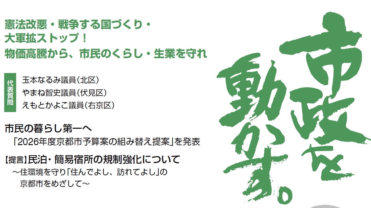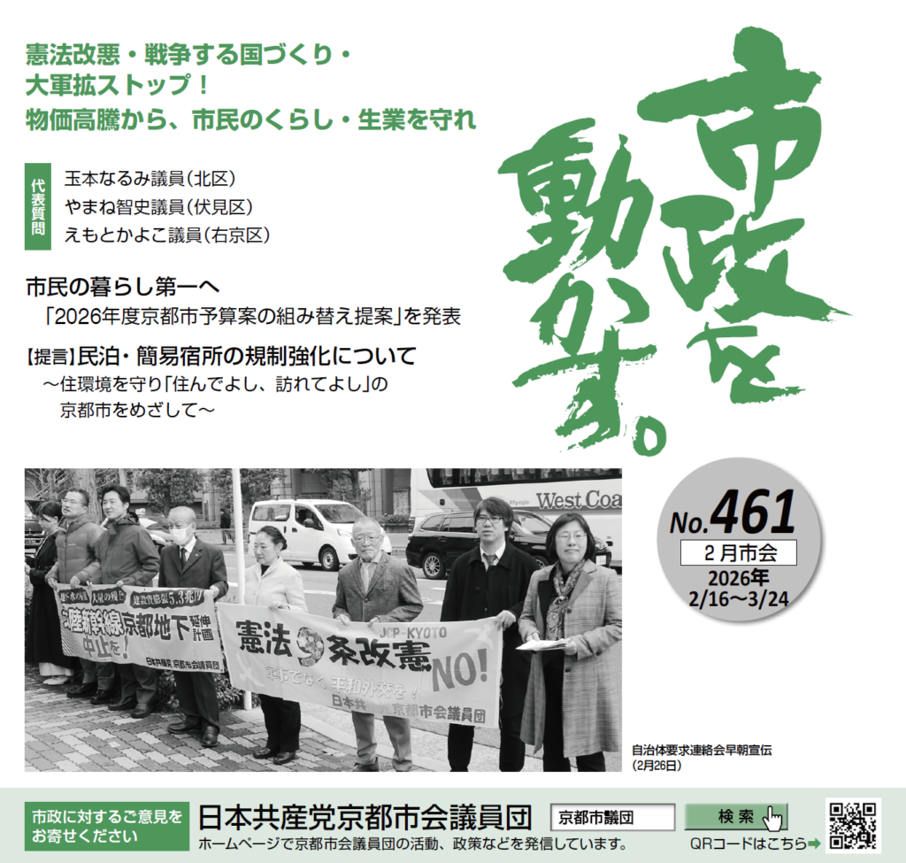 党議員団ニュース「市政を動かす。」No.461が完成しました 2026.03.23 お知らせ 党議員団ニュース「市政を動かす。」No.461(2026年2月市会)が完成しました。 以下のPDFデータよりぜひご覧ください。 PDFはこちら→「市政を動かす。」No.461